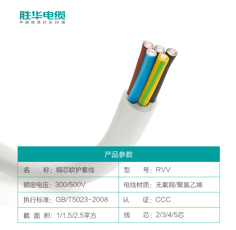 胜华软护套线RVV/2 3 4芯*1/1.5/2.5平方铜电线电源线信号控制线